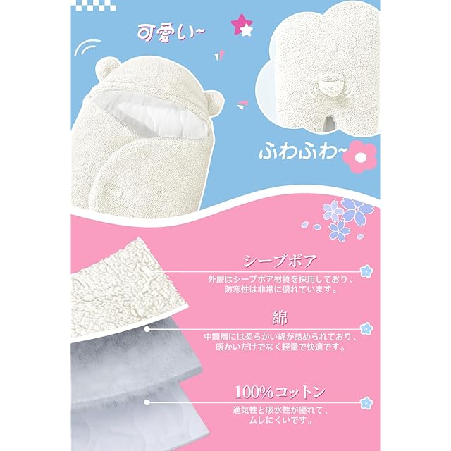 【吸汗性&通気性抜群】やわらかいコットン素材を採用し、蛍光剤と漂白剤などの有毒な染料がありません。シープボア生地のデザインで通気性が優れて、ムレにくく、赤ちゃんが快適に過ごすことができます。吸水性が良いので、汗をかきやすい赤ちゃんにも対応します。洗濯後もすぐに乾けます。初めてのご使用の前に洗濯をお願いします。