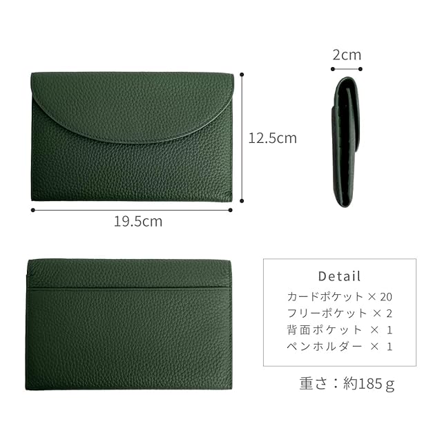 【2023年改良版】スムーズに取り出しができるように若干サイズを大きく変更しました。【スペック】 ・カードポケット × 20 ・フリーポケット × 2 ・背面ポケット × 1 ・ペンホルダー × 1 【サイズ】 ・縦 125mm × 横 195mm × 厚み 20mm ・重さ 185g 【素材】 ・表地:牛革 ・裏地:マイクロファイバー