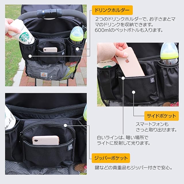 ベビーカーをそのまま畳んでも、入れたものが落ちないジッパーポケットがとても便利と好評です。 各ポケットに哺乳瓶や携帯電話、鍵、お財布、スマートフォン、おむつ、抱っこ紐、ドリンク等、あらゆる物がこれ1つで収納できます。