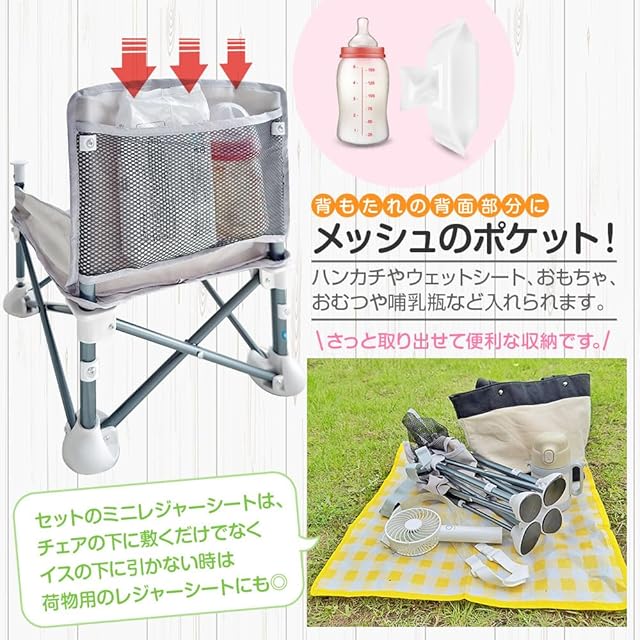 ●【ミニレジャーシートがセット】ミニレジャーシートがセットになっているので、床の食べこぼしの汚れ防止や、屋外で使用する際にも敷物としてもお使い頂けます。背面部分にあるメッシュのポケットにいつでも収納可能です。