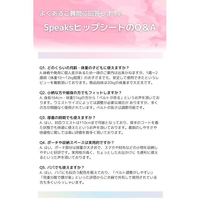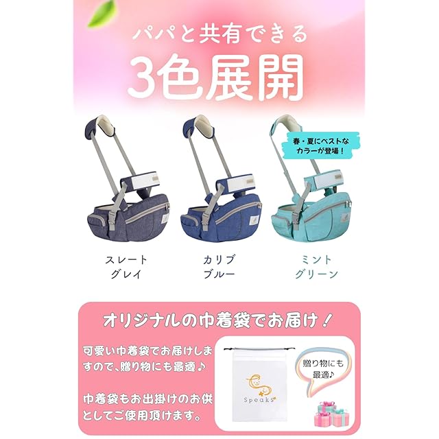 「抱っこが楽に、さらに楽しく」をコンセプトとしたSpeaksのヒップシートは育児の快適さと共に親子の触れ合いをサポートする商品です。