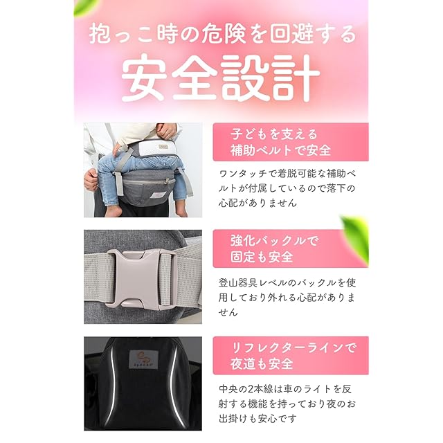 ポイント② 落下防止の安心設計 ヒップシートの台座は滑り止め加工によりお尻がズレ難く、またお子様の腰に巻き付けるタイプの付属ベルトも用意している為、落下の心配もありません。