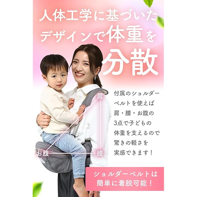 ポイント① 腰の負担を大幅に軽減 人体工学に基づいた設計は付属のショルダーベルトを用いることで肩・腰・お腹の3点でお子様の体重を適正に分散し、ママやパパの腰への負担を大幅に軽減します。また、メインベルトには幅を持たせ、食い込みも軽減しています。