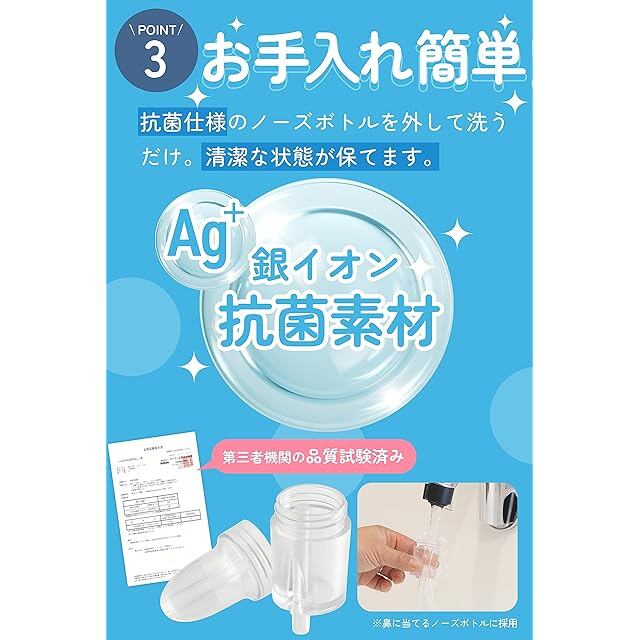 ✅【Ag+銀イオンをノーズボトルに採用】簡単お手入れで、清潔・衛生を保つことができる子供用鼻水吸引器です。ノーズボトルにAg+銀イオンを使用しているため、微生物の繁殖を抑え、清潔な状態で赤ちゃんの鼻水吸引が可能です。しかも、ノーズボトルは取り外して水洗いできるのでお手入れも簡単です。