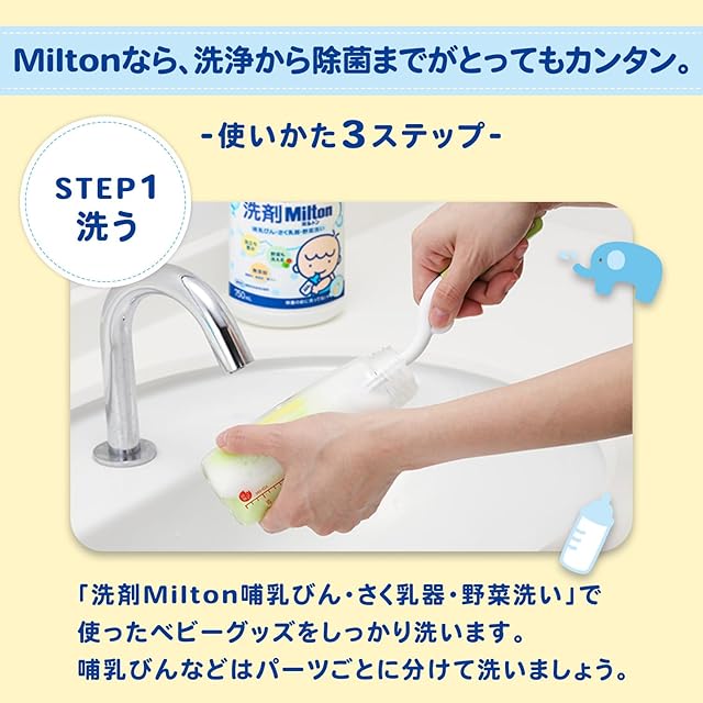 【洗剤Milton哺乳びん・さく乳器・野菜洗い 本体 750ml】 哺乳びん、おもちゃ、離乳食用野菜などの洗浄に! ●無香料・無着色・無リン、植物性洗浄成分使用。 ●しっかり洗えてすすぎもラクラク♪