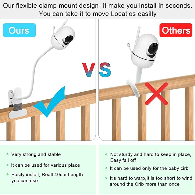 安定性と耐久性:当社のグースネックのアームは、より良い素材とデザインを採用しています。アルミニウムとマグネシウム合金製で、安定性と耐久性の両方が向上しています。何千回も曲げた後でもNooieベビーモニターをしっかりと保持できます。滑り止めクランプはフォーム素材で覆われており、家具の損傷や傷を防ぎます。
