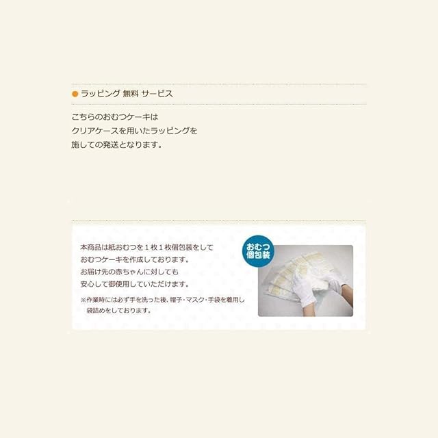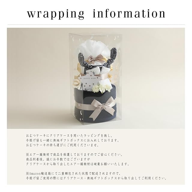 【梱包】おむつケーキにクリアケースを用いたラッピングを施し、手提げ袋も一緒に無地ギフトボックスにお入れしております。おむつケーキの持ち運びにご利用くださいませ。 ※エアー緩衝材で商品を保護しておりますのでご安心ください。商品到着後、誠にお手数ではございますがクリアケースから取り出したエアー緩衝材は破棄お願いいたします。 ※Amazon輸送箱にて二重梱包された状態で配送されますので、手提げ袋ご使用の際にはクリアケース・ギフトボックスから取り出してご利用ください。