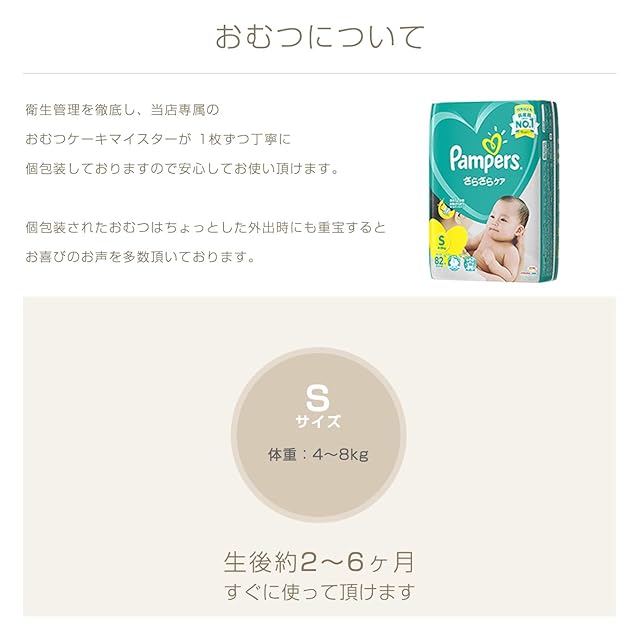 おむつケーキに巻くリボンのお色は『ベージュ・アイボリー系』 【おむつの枚数】パンパーステープタイプSサイズ×18枚 ☆目安☆Sサイズ(4-8kg) 【製品サイズ】幅18cm×奥行き18cm×高さ38cm