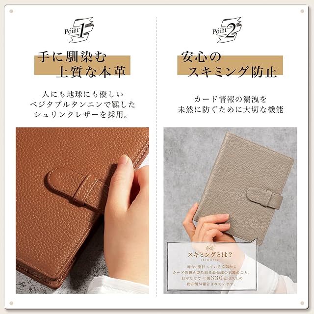 【今の時代に欠かせないスキミング防止機能】 近年急速にキャッシュレス化が進み、カードで支払いできるお店も増えてきて、カードでの支払いが主流になって来ました。 カードで簡単に支払いができる便利な世の中になった反面、スキミングという恐ろしい犯罪も増えて来ました。 スキミングとは、専用の機械を使って、クレジットカードやキャッシュカードなどの大切な情報を盗み取る犯罪です。 近づいただけで知らない間に大切なカード情報を盗み取られてしまう危険性があります。 そんな恐ろしいスキミングの被害からあなたを守るべく、スキミング防止機能を搭載しました。 特殊なフィルムを織り込むことで、外部からの電波をシャットアウトします。 カードをカードポケットに入れておくだけでスキミングの被害を防ぐことができます。大切なカード情報をしっかり守ります。