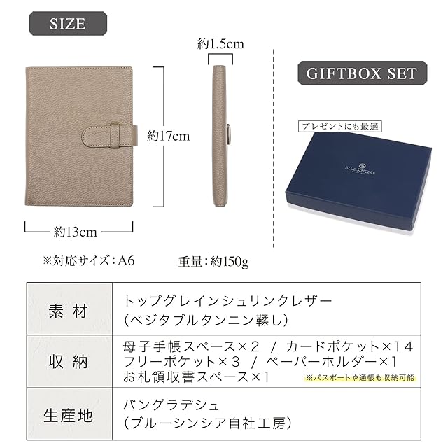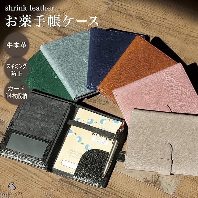 [BLUE SINCERE] お薬手帳 ケース 本革 大容量 ペンホルダー付 母子手帳 カバー まとめて収納 通院 財布 レディース メンズ ギフトボックス付き / KT1 (ダークネイビー, A6(右利き用))