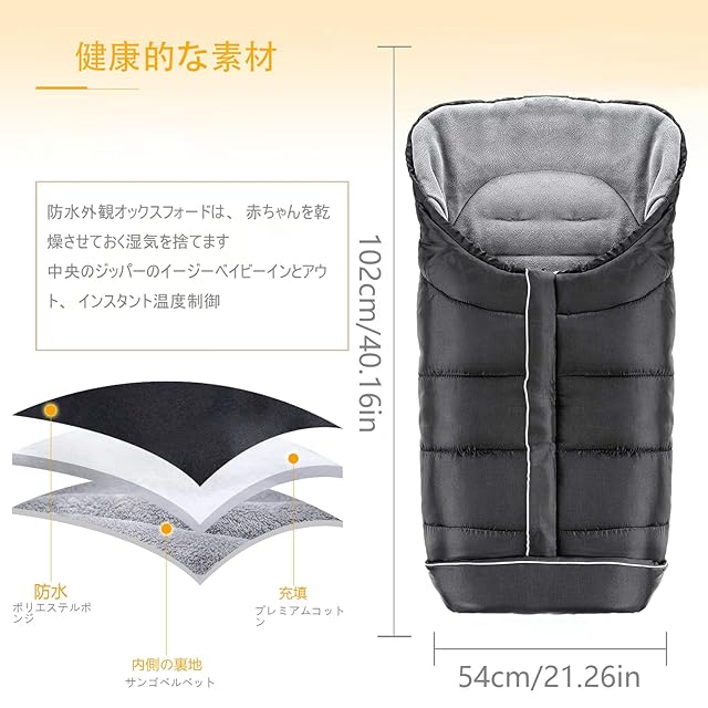 【しっかり防寒】ふんわり素材が体を包み込み、寒い冬のお出かけも快適に。 防水コーティングにより、雨や雪でも安心です。 防風フットカバーで赤ちゃんをやさしく包み込み、まるで腕の中にいるような気分に。