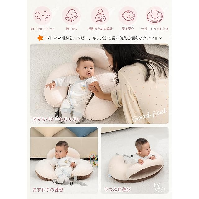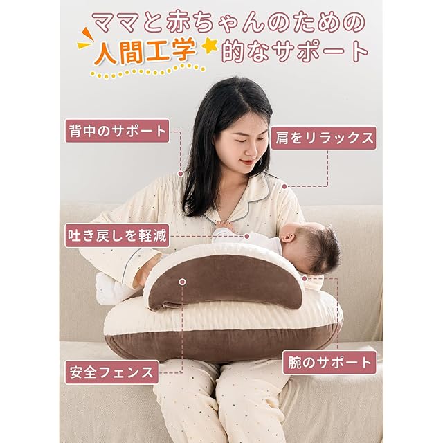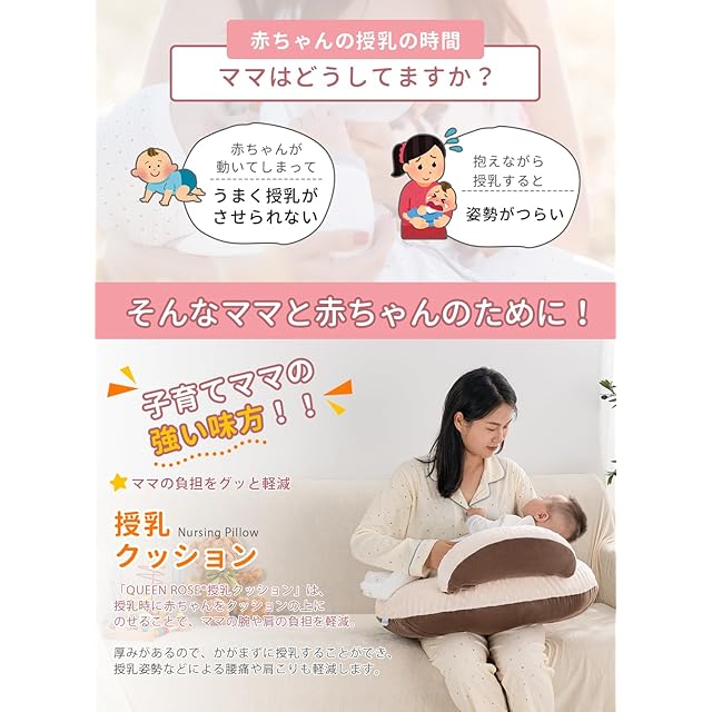 QUEEN ROSE 授乳クッション 授乳枕 ベビークッション 抱き枕 妊婦 新生児 赤ちゃん クッション 硬め マタニティ 調節可能なストラップ付き ヘタリにくい かわいい リバーシブル 丸ごと洗える コットン 授乳グッズ おすわりクッション 出産祝い U字 ブラウン