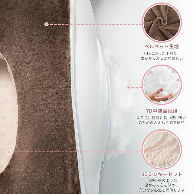 【商品仕様】サイズ:61×46×30cm。重さ:約1.65kg。素材:カバー(リバーシブル):表面:ミンキードット生地、裏面:ベルベット生地。内層カバー:ポリエステル100%(ピーチスキン加工)。中綿:7D中空繊維綿(普通の綿よりふんわりとしています)。※授乳枕カバーは取り外して洗濯機で洗えます。