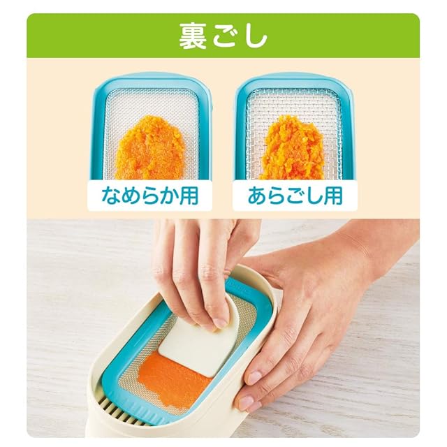 【調理セット内容】こし網(なめらか用とあらごし用)、ヘラ、裏ごし容器・おかゆ調理用フタ、すり鉢・おかゆ調理容器、スプーン、離乳食冷凍小分けトレイ(15・25ml)2枚 離乳食スタートガイド