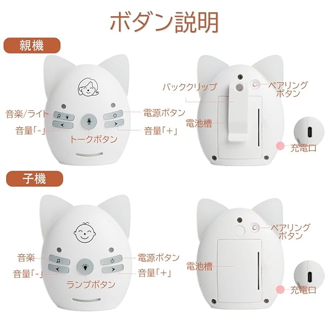 子守り唄:子機は遠隔操作できる子守り歌を内蔵し、そして親機から再生、停止ができます。