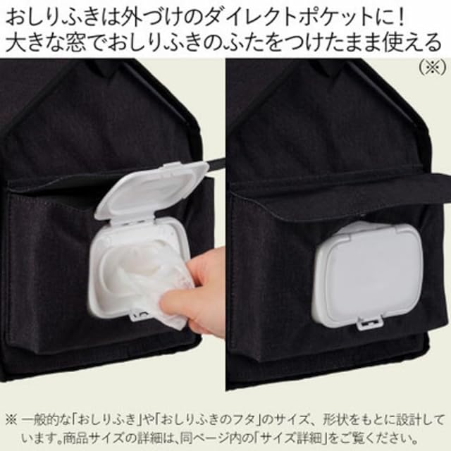 ひと目でわかる定位置管理…複数の専用ポケットでどこになにがあるかわかりやすい。使用頻度の高いおしりふきは外づけのダイレクト専用ポケットで必要なときにすぐ取り出せる!