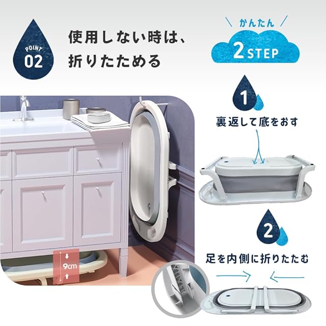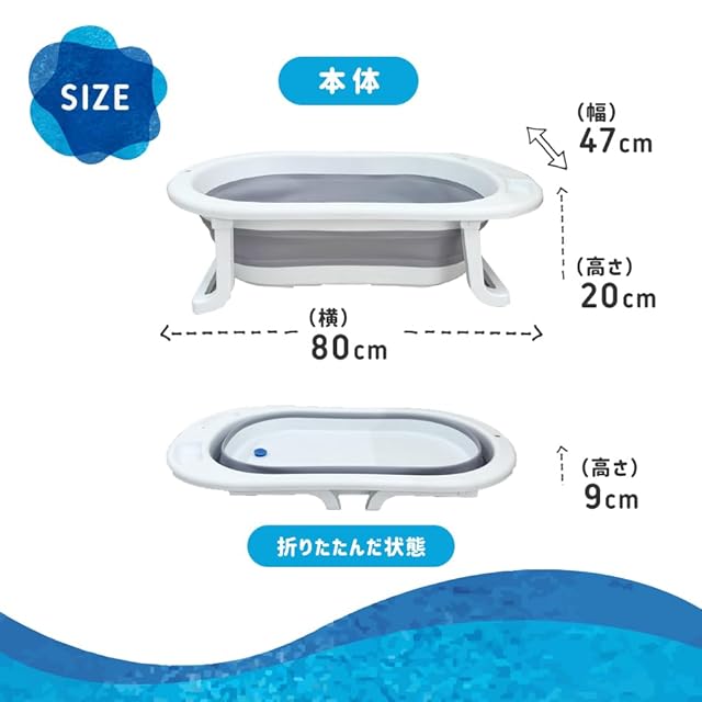 【折りたたみ可能なベビーバス】ゴム製の柔らかい素材を使用している為簡単に折り畳みができ、折りたたんだ場合、縦9cmの為、隙間収納が可能です。広々とした浴槽の為、子供を座らせて使用可能です。アウトドア使用、お子様の水遊び、靴洗い、ペットのお風呂など使用用途が様々です。