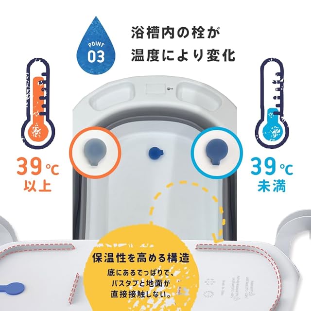 【温度変化が分かる浴槽】浴槽内の水を抜く栓が温度により変化します。(39℃未満:青、39℃以上:水色)