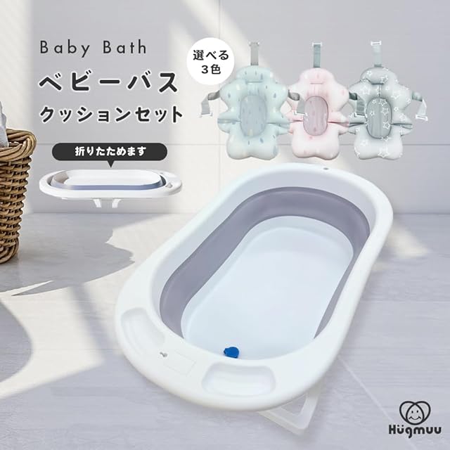 ベビーバス 折りたたみ式 バスチェア 赤ちゃん ベビー バスクッション お風呂 沐浴 Hugmuu (Gray)