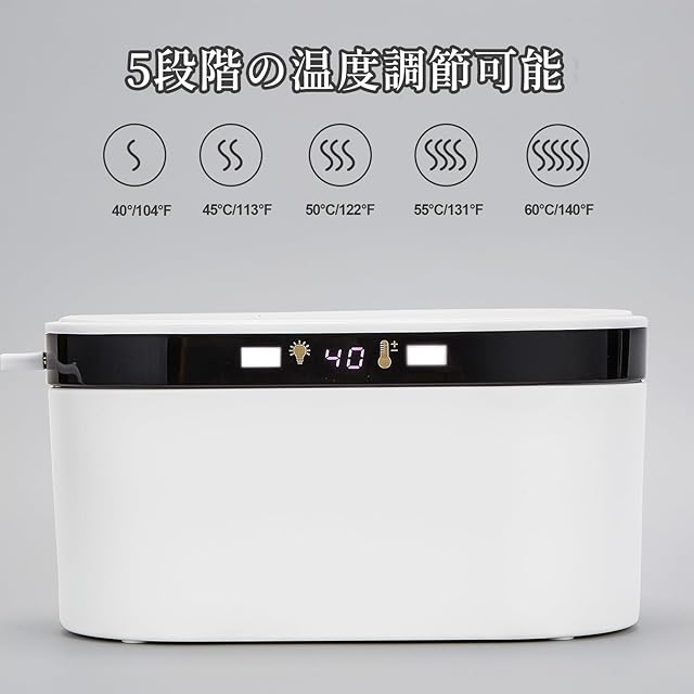 5段階の温度設定 40℃、45℃、50℃、55℃、60℃(104°F、113°F、122°F、131°F、140°F) 室温に応じた夏・冬の温度設定が可能。リアルタイム温度と希望の温度を表示するLEDスクリーン。 FとCのコンバーチブル。
