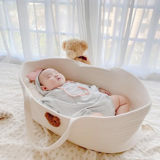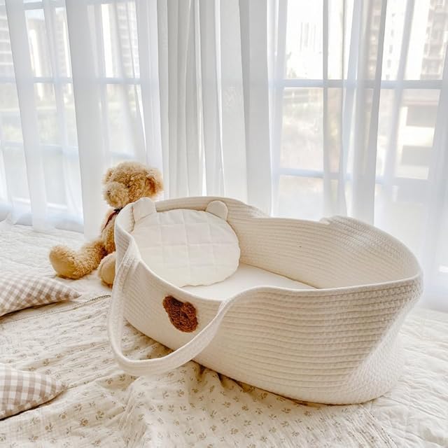 ベビーかご 赤ちゃん 綿100 ゆりかご ベビーベッド 新生児用ハンドバスケット オムツ替え お昼寝マット 風を防ぐ 丈夫 出産祝い 贈り物 (ヒグマの頭)