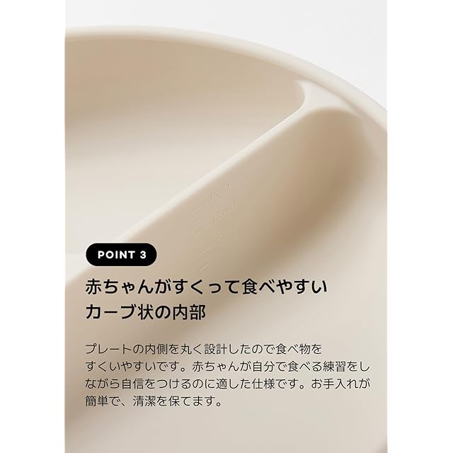 【マジックカーブ】ボウルは片面の壁が高いカーブに設計されていて 赤ちゃん一人で「マジックカーブ」に沿ってスプーンを持ち上げると、ちょうどいい一口サイズの量になります。