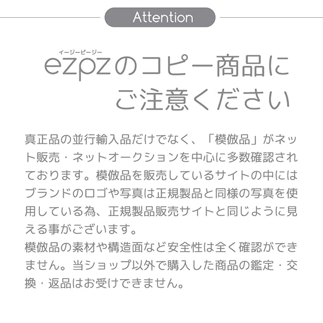 ✅ コピー商品にご注意ください。ezpzによく似た商品がインターネットのショッピングサイトやオークションなどで販売・出品されていることが多数確認されております。模倣品の素材や構造面などの安全性は全く確認ができません。使用している画像はezpzですが、送られた商品は模倣品だったという悪質な事例も報告されています。当ショップ以外で購入した商品の鑑定・交換・返品はお受けできません。当ショップでは模倣品につきましての一切の責任を負いかねます。