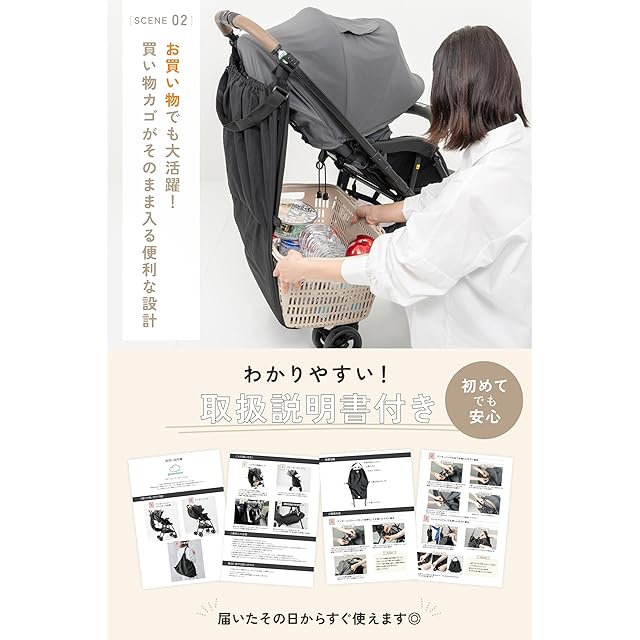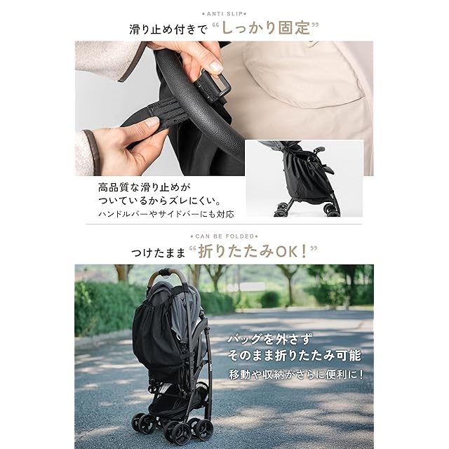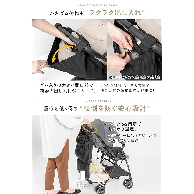「これがあるとベビーカーが一気に便利になった!」と多くのママたちから嬉しい声が届いています。特に「大容量なのにスッキリ収納できる!」と、収納力とスマートなデザインの両立が好評。さらに、2箇所固定の安全設計により、ベビーカーの転倒リスクを減らせるのもポイントです。品質にもこだわり、耐荷重テストをクリアした設計で、安心して長く使えるクオリティを保証します。