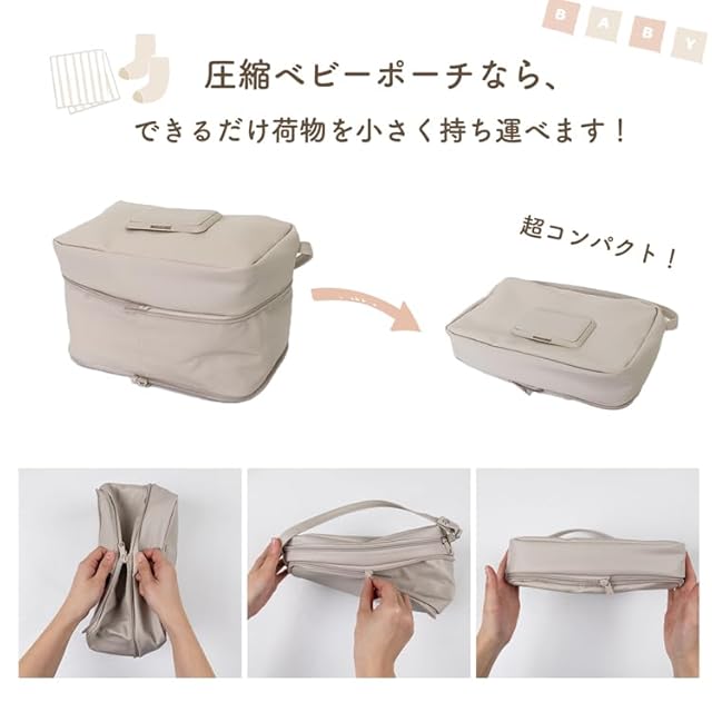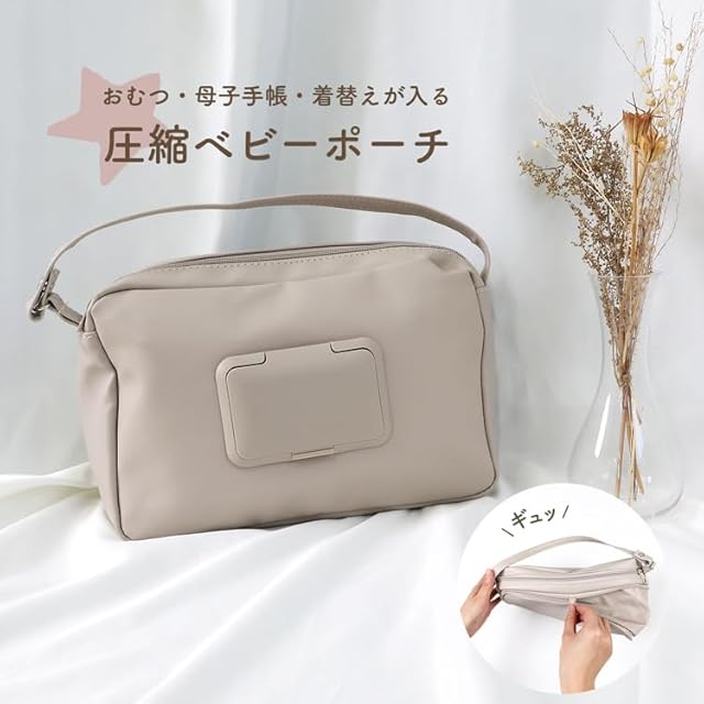 【圧縮してコンパクトに】おむつ・母子手帳・着替えなど、これひとつにギュギュっと収納!大容量サイズですが、圧縮ポーチなので、超コンパクトにまとめられます◎ おしりふきシートもセットできるので、あっという時にササっと取り出せます!ベビーカーハンドルやバッグに取り付けられるショルダーつき!