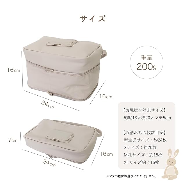 【素材】<表側>合成皮革、<裏側・パイピング>ポリエステル100% 【サイズ】本体サイズ:<圧縮前>約縦16×横24×マチ16cm、<圧縮後>約縦16×横24×マチ7cm 【仕様】お尻拭き対応サイズ:約縦13×横20×マチ5cm、収納おむつ枚数目安:<新生児サイズ>約24枚、<Sサイズ>約20枚、<M/Lサイズ>約18枚、<XLサイズ>約16枚 ※メーカーによっても収納できる枚数は異なります。