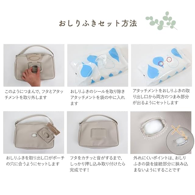 【おしりふきセット方法】1.つまんでフタとアタッチメントを取り出します。2.おしりふきのシートを取り除きアタッチメントを袋の中に入れます。3.アタッチメントをおしりふきの取り出し口から両方のつまみ部分が出るようにセットします。4.おしりふきを取り出し口がポーチの穴に合うようにセットします。5.フタをカチッと音がするまでしっかり押し込み、取り付けたら完成です!