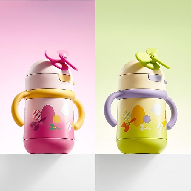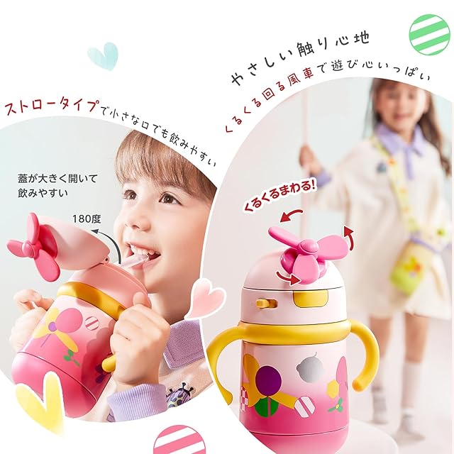 【bc babycare】ボトル 子供用 ステンレスボトル ストロー付き ストラップ付き くるくる回る風車 300ml 保温 保冷 ステンレス アウトドア 遠足 キャンプ 両手持ち 通園通学 (グリーン)