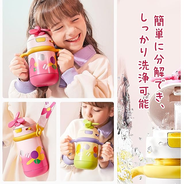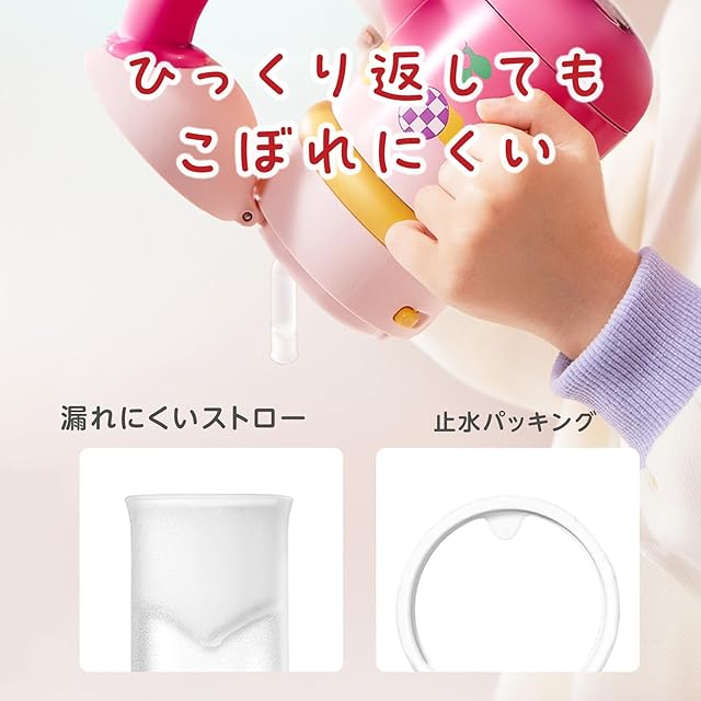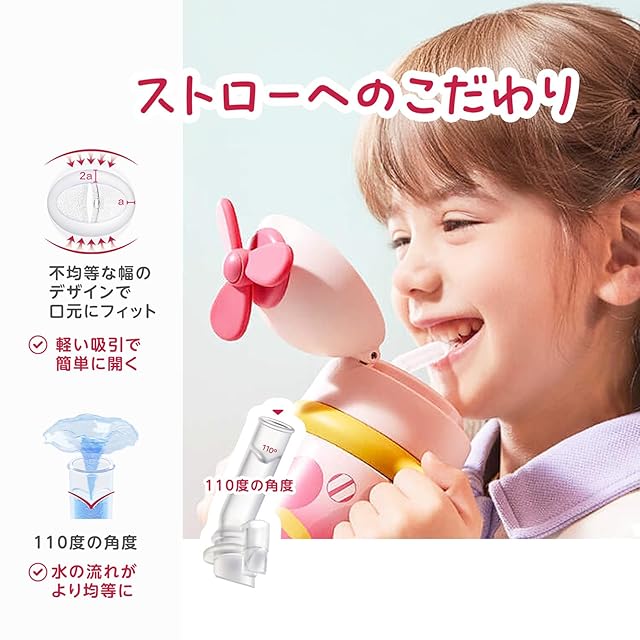 お子様ためのストロー付き:お口の小さいお子様にはストロータイプになっており、より飲みやすくなります。ストロー出口は不均等な幅のデザインで口元にフィットする、軽く吸引で簡単に開く。ストローは幅110度の角度で調整できますので、水の流れがより均等になります。止水パッキングに付いているので、ひっくり返してもこぼれにくいです。