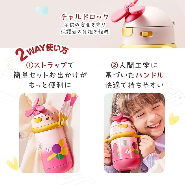 商品のポイント:ハンドル付きのデザインで両手持ち可能です。小さなお子様でも両手で持つため、安定して飲みやすくなります。さらにストラップも付属してまして、通園通学や遠足、キャンプなどには最適です。