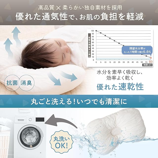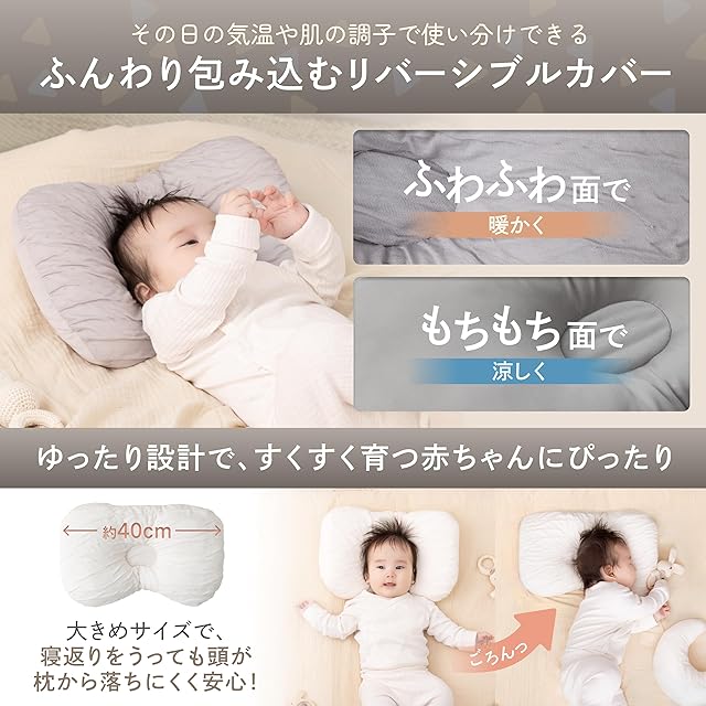 【汗っかきのお子様へ!40cmワイドで長~く使える】 汗をかきやすい赤ちゃんにもキッズにも、独自の高吸湿・速乾生地でさらっと快適睡眠。横幅40cmの設計だから、成長しても頭をしっかり支えて、長く使えます。寝返りをうっても頭が枕から落ちにくく、眠りをしっかりサポート。