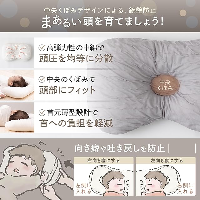 【まあるい頭と安心な眠りをサポート】 中央のやさしいくぼみが、赤ちゃんのやわらかい頭を包み込み、頭のかたちを整えるお手伝い。インサート付きで、向き癖の予防・改善にも役立ちます。