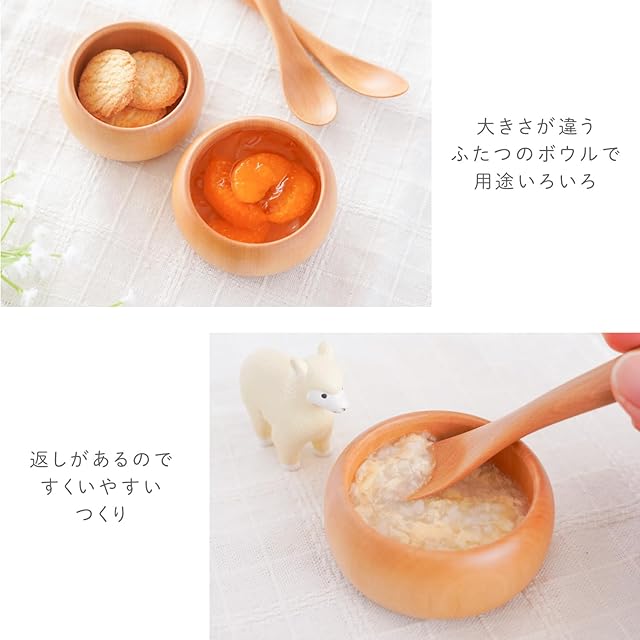 ■セット内容:ボウルS/ボウルSS/ベビースプーン/ママスプーン ■材質:ツゲ [ボウルS] ■サイズ:φ75mm×35mm ■重量:約41g ■容量:約70ml(満水時) [ボウルSS] ■サイズ:φ70mm×33mm ■重量:約38g ■容量:約50ml(満水時) [ベビースプーン] ■サイズ:120mm×23mm ■重量:約5g [ママスプーン] ■サイズ:160mm×20mm ■重量:約7g
