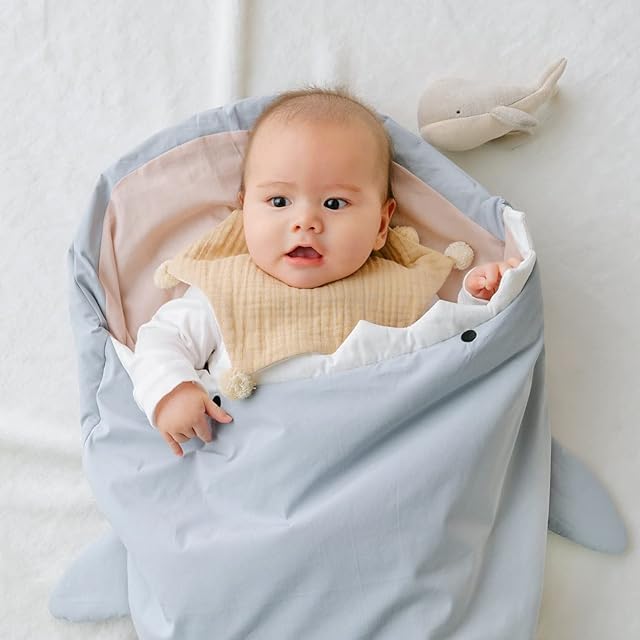 RIO スリーピングバッグ さめ ベビー用品 赤ちゃん 新生児 ベビー寝袋 出産祝い おくるみ アニマルデザイン 防寒 ふわふわ 暖かい 可愛い (サックス)