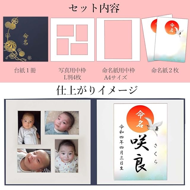 中枠2枚(命名書用/L判写真4枚用)・命名紙2枚付き 日本製