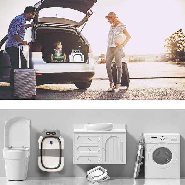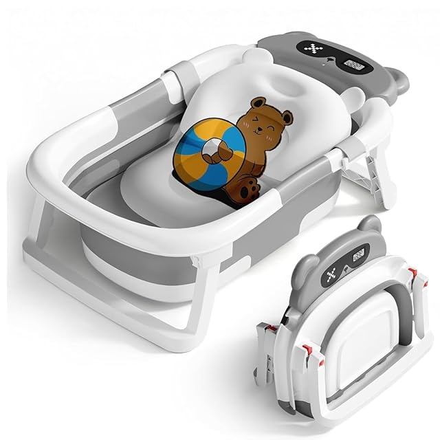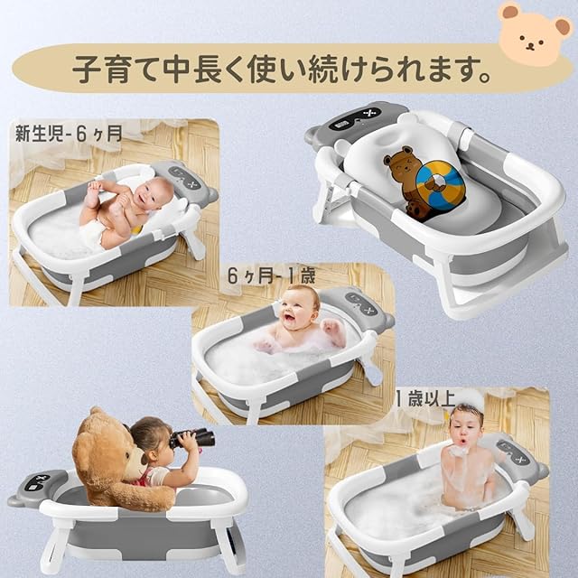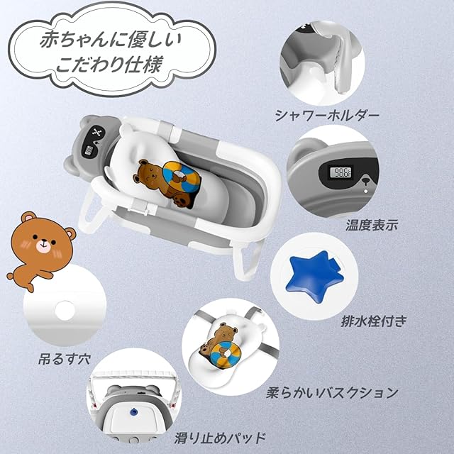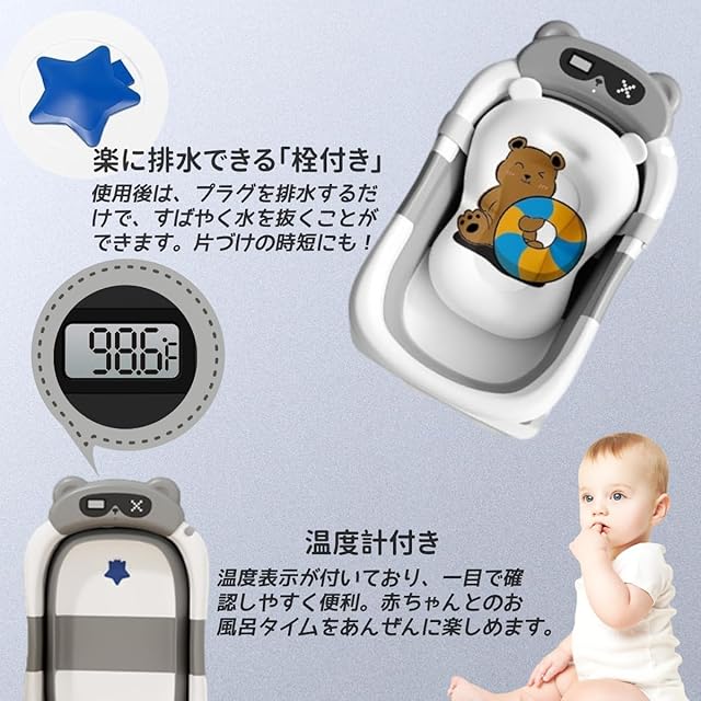 SHAKE BEAR® ベビーバス 折りたたみ式 ベビー用浴槽 湯温計 バスクッション付き 赤ちゃん 新生児 沐浴 ベビー お風呂 0~6歳 バスタブ コンパクト 水抜栓付 赤ちゃん用 出産祝い ギフト (グレー)