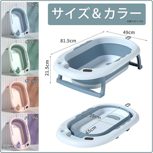 Puhang ベビーバス 赤ちゃん浴槽 温度計付き 子供用風呂桶 児童バスタブ 洗濯バケツ 折りたたみ 滑り止め設計 水抜き穴 吊り下げ穴付き 髪洗いカップ付き 収納容易 持ち運び 0~6歳 グリーンB 81.5*49*21.5cm