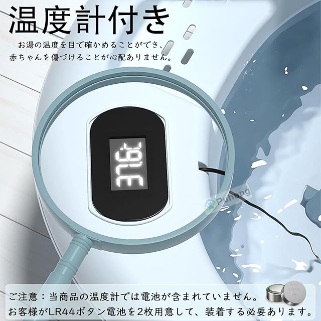 ★【高品質素材】ベビーバスは環境にやさしいPP素材と快適で柔らかいTPE材料で作られており、ビスフェノールAなどの有害物質は含まれず、耐久性があります。温度計付き、お湯の温度を目で確かめることができ、赤ちゃんを傷づけることが心配ありません。ご注意:温度計の電池が含まれていません。お客様がLR44ボタン電池を2枚用意して、装着する必要あります。