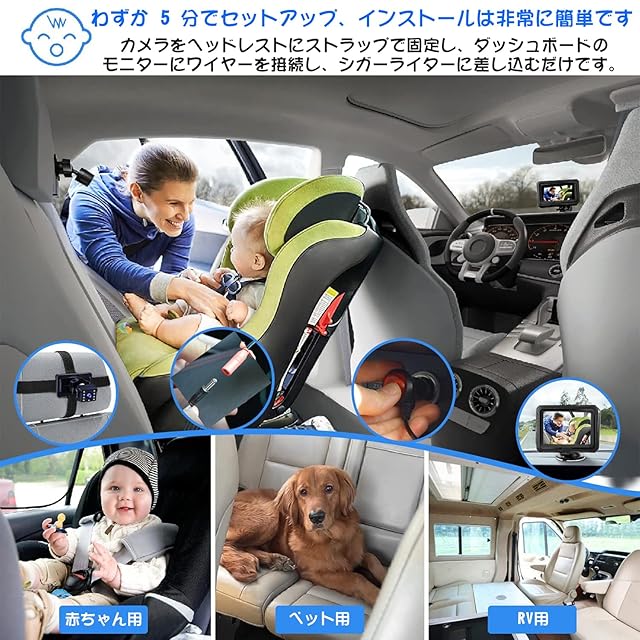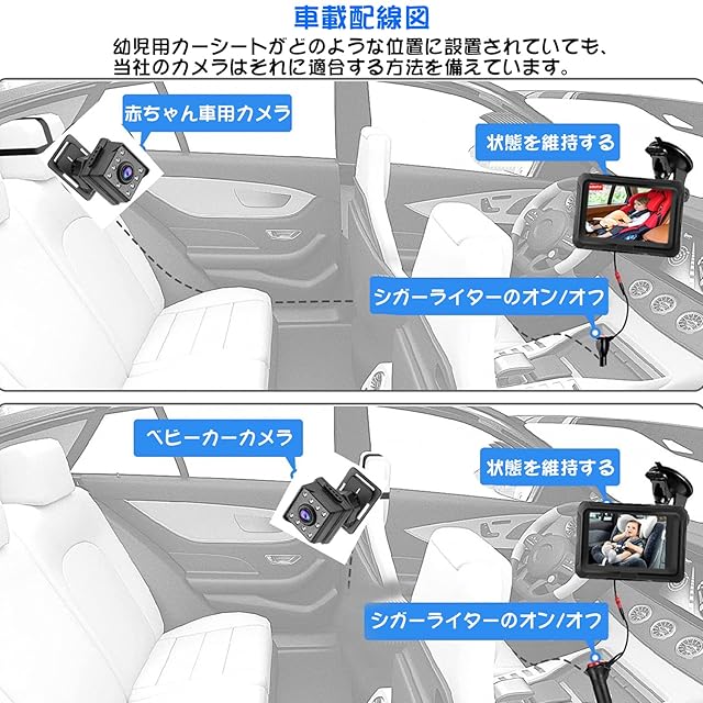 【取り付け簡単、安定】このベビーモニター 車用リアビューカメラは取り付けが簡単で安定しており、専門的な工具は必要なく、数分で取り付けることができます。ベビーカメラを座席の枕に固定し、ベビーモニターをリアカメラに接続して、12V の車のシガレット ライターに差し込むだけです。この 12V 電源は、ほとんどの車、トラック、バン、SUV で使用できます (USB はサポートされていません)。また、車内の配線を簡単に整理できるようにケーブル タイも付属しています。