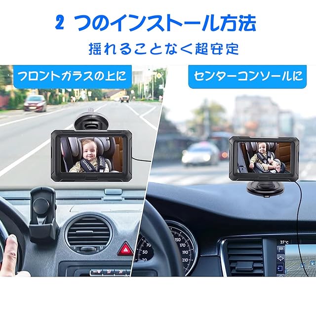 【ベビーセーフティカーモニターの2つの取り付け方法】車用ベビーモニターは車のセンターコンソールまたはフロントガラスに設置でき、吸盤の吸引力は非常に強く、凹凸のある道路、緊急ブレーキ、急カーブでも優れた安定性を提供します。車 ベビーモニターは振動したり、揺れたり、動いたりしないため、運転に集中でき、安全な旅行を確保できます。