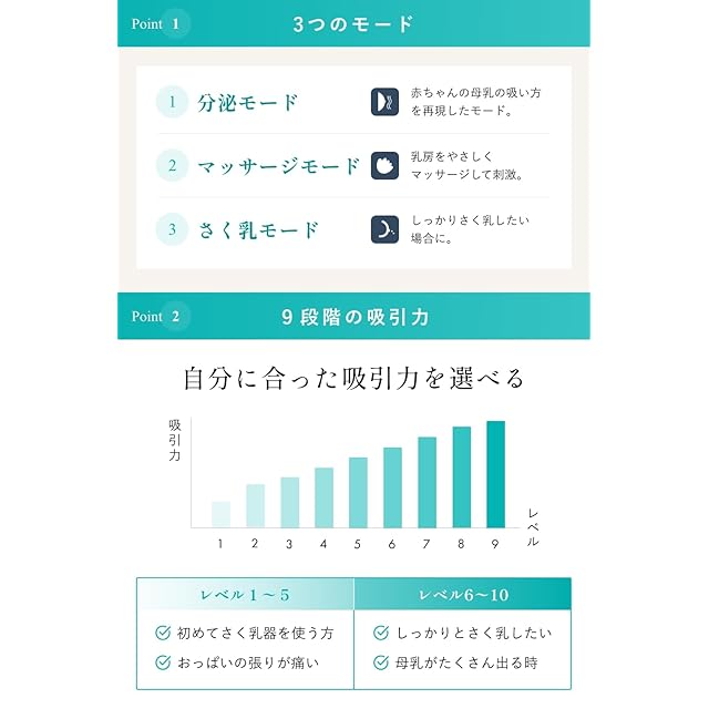 【選べる強さ9段階】その時のおっぱいの状態に合わせて強さが9段階に調節できるので、自然なさく乳ができます。