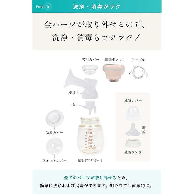 【洗浄・消毒がラク】パーツごとの構造がシンプルで分解・組み立ても約1分前後で完了! 毎日の洗浄および消毒も楽ちんです。※電子レンジでの消毒は不可。100°Cのお湯で15 分間、煮沸消毒を行ってください。