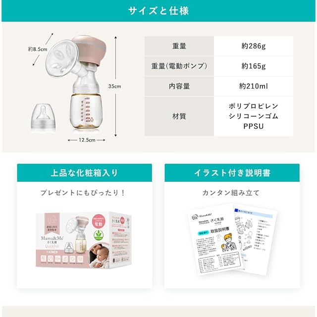 【高級感あるパッケージ】高級感を演出するため、パッケージデザインは、イギリス在住の主婦兼デザイナーが設計。ギフトにも最適です。【メーカー90日間保証】不具合などありましたらお気軽にお問い合わせくださいませ。返品・交換すぐに対応致します。 【商品仕様】パッケージサイズ:(約) 約41.5×33.5×16cm、重さ:(約)286g、内容量:(約)210ml、素材:ポリプロピレン(本体、防塵カバー、乳首カバー、乳首リング、マッサージパッド)、シリコーンゴム(フィットカバー、吸引カバー、弁、乳首)、ポリフェニルサルホン (哺乳瓶)