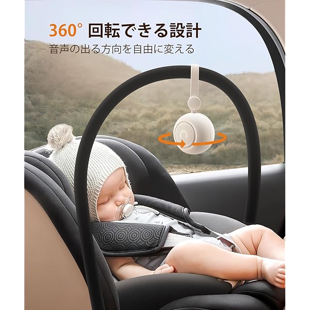 【360°回転できるシリコン製ストラップ】ストラップが付き、簡単装着してベビーカー・ベビーベッドやデスクサイドに吊り下げて、省スペースで設置できます。パパとママの要望に基づいて、ストラップが360°回転できる設計を作られて、ストラップを解く必要もなく回転するだけで音声の出る方向を変えます。