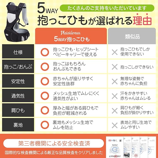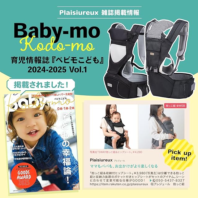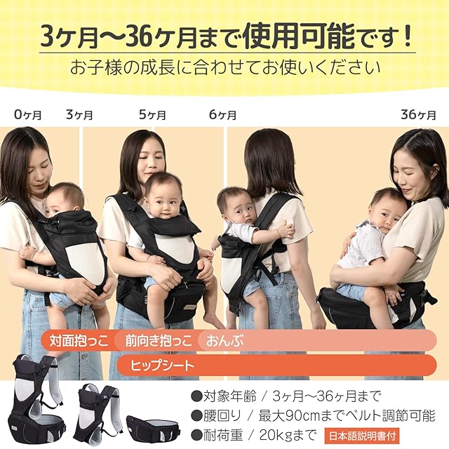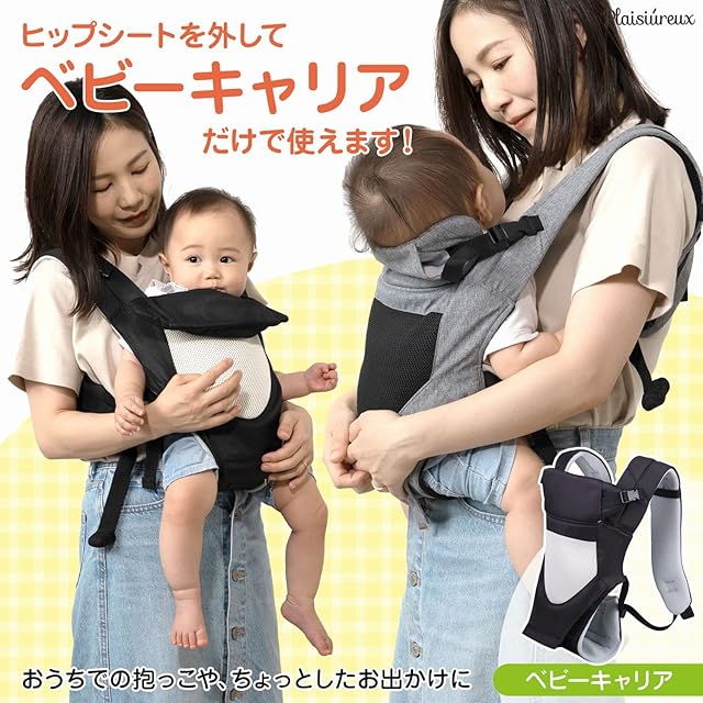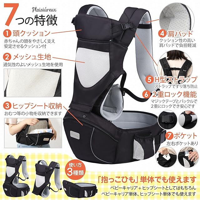 【商品仕様】○対象年齢:3ヶ月~36ヶ月まで ○ウエストサイズ:ウエスト最大90cmまでベルト調節可能 ○カラー:ブラック ○耐荷重:20kgまで ○仕様:抱っこひも&ヒップシート分離型、男女兼用、反射板付 ○付属品:説明書付 ○ブランド:Plaisiureux(プレジュール)