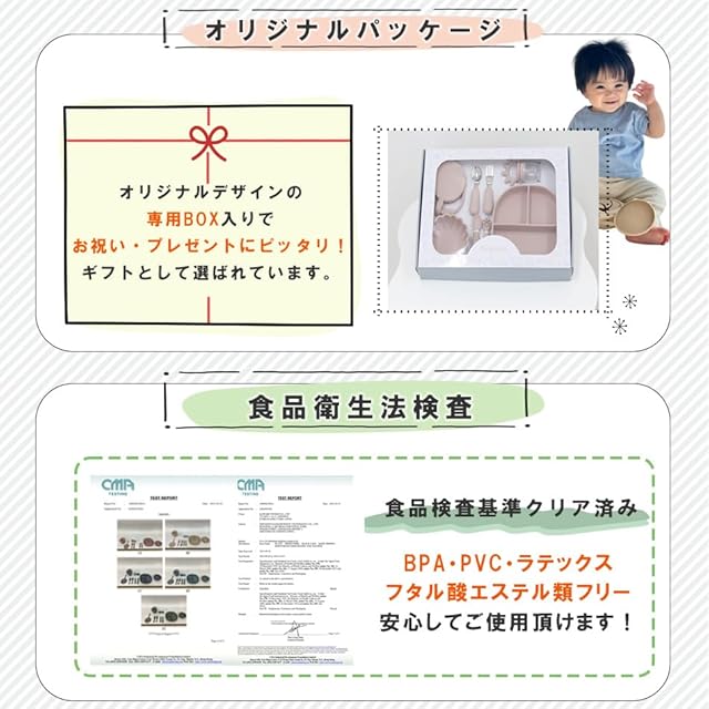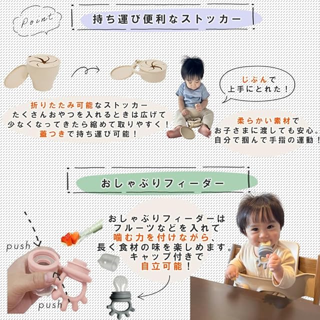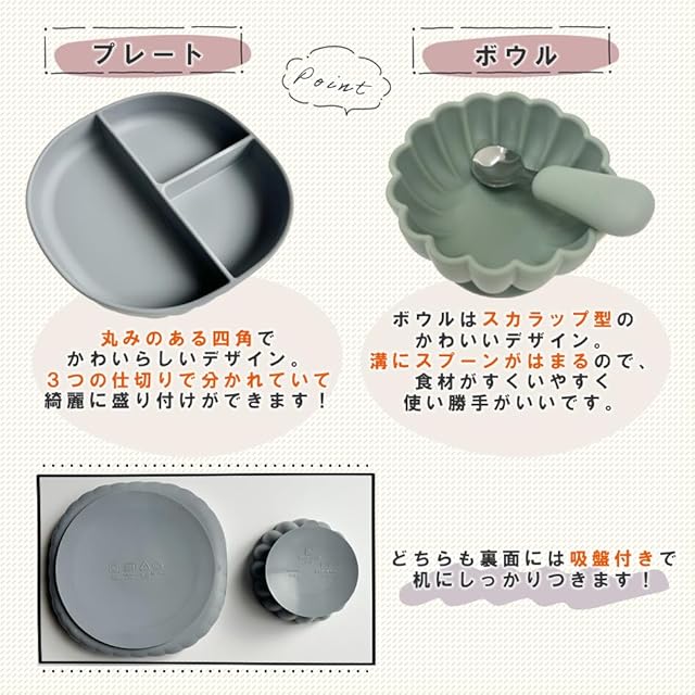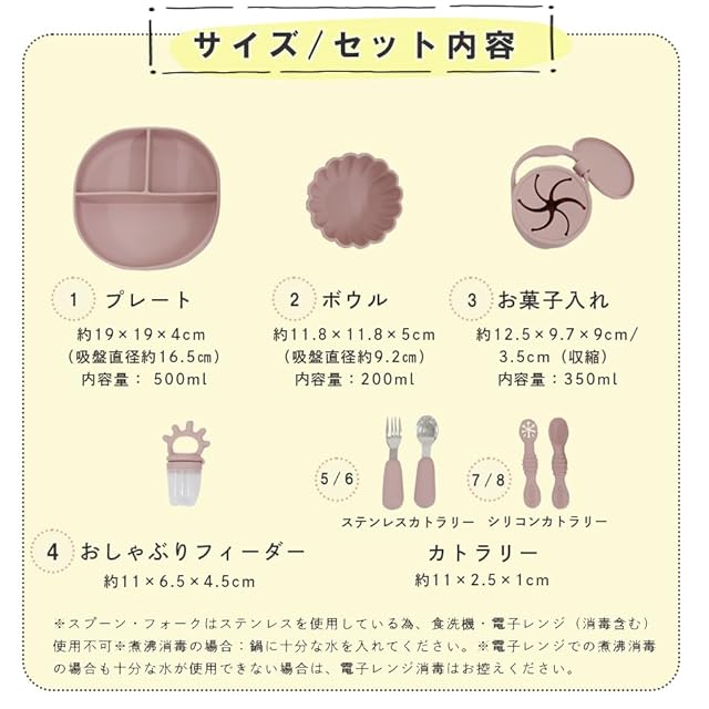 【製品仕様】プレート:約19×19×4cm (吸盤直径約16.5㎝)内容量:500ml、ボウル:約11.8×11.8×5cm(吸盤直径約9.2㎝)内容量:200ml、シリコンカトラリー:約11×2.5×1cm、おしゃぶりフィーダー:約11×6.5×4.5cm、お菓子入れ:約12.5×9.7×9cm/3.5cm(収縮)内容量:350ml、材質:シリコン、スプーン・フォーク:ステンレス ※スプーン・フォークはステンレスを使用している為、食洗機・電子レンジ(消毒含む)使用不可。※煮沸消毒の場合:鍋に十分な水を入れてください。※電子レンジでの煮沸消毒の場合も十分な水が使用できない場合は、電子レンジ消毒はお控えください。【海外生産品による留意事項】生産は海外で行っており、糸のほつれ、細かいキズ、多少の汚れ、多少の匂い、外箱の傷等がある場合がございます。(明らかな不良品はこの限りではございません)